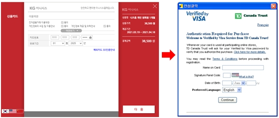 - 국내 카드 결제 시 안심클릭 등록 후 이용하는 것과 같은 단계로 이해하시면 됩니다.