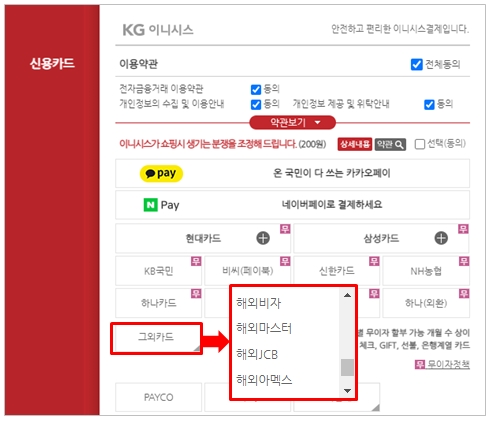 신용카드 결제창에서 ‘그외카드’를 클릭한 후, 원하는 카드를 선택하세요.