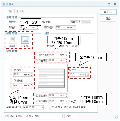용지 여백과 용지 방향을 아래와 같이 설정합니다.