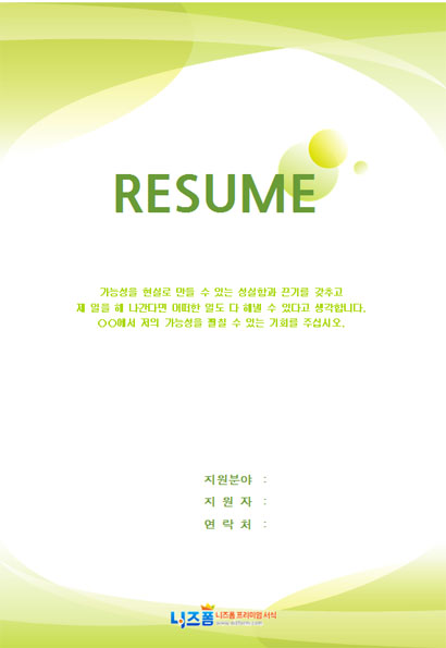 본 콘텐츠는 니즈폼(www.nizform.com)을 통해 서비스되는 이력서표지(연두색)(으)로서, 다운로드 받으신 후, 내용을 수정하거나 입력하여 사용하시면 됩니다.
