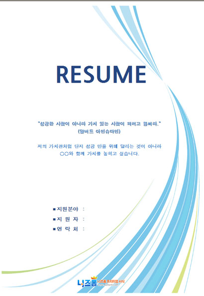 본 콘텐츠는 니즈폼(www.nizform.com)을 통해 서비스되는 이력서표지(파란색물결)(으)로서, 다운로드 받으신 후, 내용을 수정하거나 입력하여 사용하시면 됩니다.