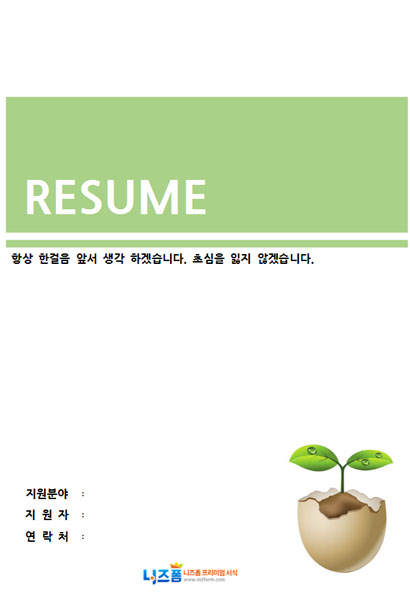 본 콘텐츠는 니즈폼(www.nizform.com)을 통해 서비스되는 이력서표지(새싹)(으)로서, 다운로드 받으신 후, 내용을 수정하거나 입력하여 사용하시면 됩니다.