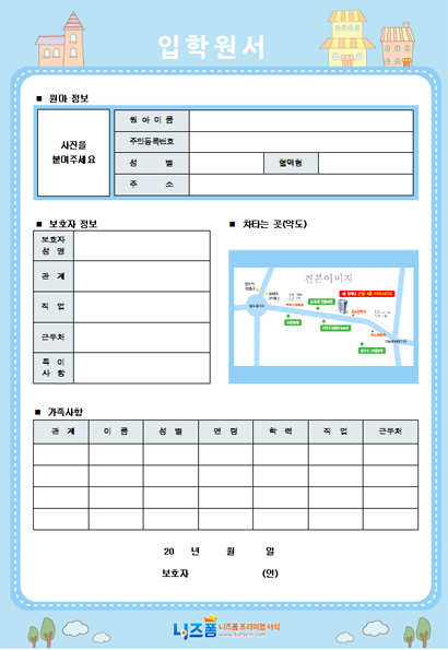 본 서식은 니즈폼(www.nizform.com)을 통해 서비스되는 어린이집입학원서_유치원입학원서(약도포함)(으)로서, 다운로드 받으신 후, 내용을 수정하거나 입력하여 사용하시면 됩니다.