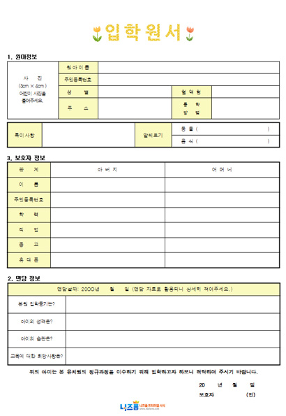 본 서식은 니즈폼(www.nizform.com)을 통해 서비스되는 어린이집입학원서_유치원입학원서(면담정보포함)(으)로서, 다운로드 받으신 후, 내용을 수정하거나 입력하여 사용하시면 됩니다.