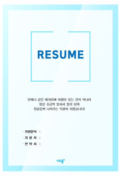 본 콘텐츠는 니즈폼(www.nizform.com)을 통해 서비스되는 이력서표지(하늘색배경)(으)로서, 다운로드 받으신 후, 내용을 수정하거나 입력하여 사용하시면 됩니다.